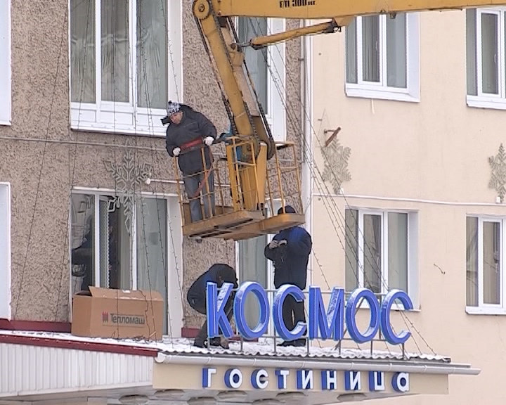 Пока мероприятия проведены незначительные, сегодня специалисты КБУ растянули гирлянду на гостинице "Космос".
