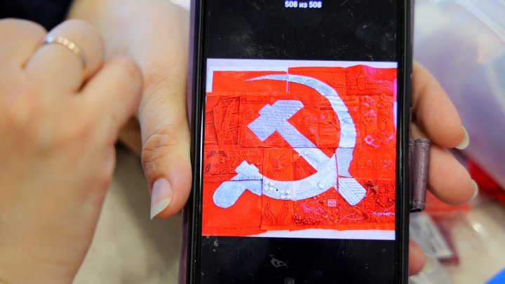 «Сначала хотели мы в Бессмертный полк с ним попасть, но дело в том, что Знамя очень тяжелое. Даже сейчас, еще не до конца оно прошито, но уже отдельные элементы - надпись, серп и молот в районе 5-7 кг весят. Поэтому сейчас мы решаем вопрос со статичной выставкой у нас здесь, в самом крупной кинотеатре города».