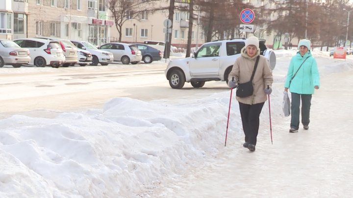 Валентина Дмитриевна: «Ну, конечно, скользко. Видите? И палки у меня ещё и шипы и даже эти палки скользят, а что делать? Чистить надо, посыпать больше».